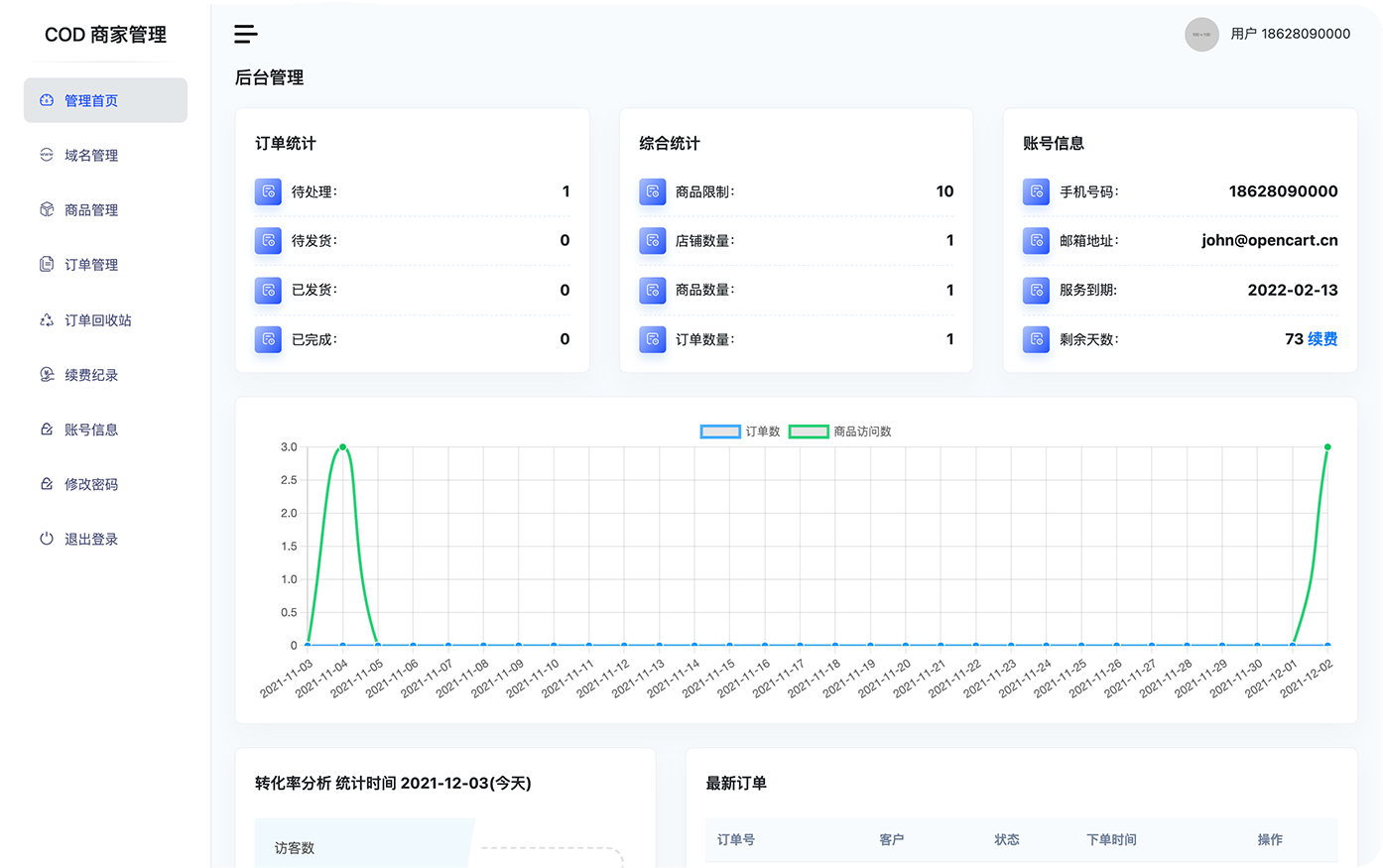 一键开店/自有域名/快速商品上架/订单提醒/订单审核/FB像素跟踪/每日报表